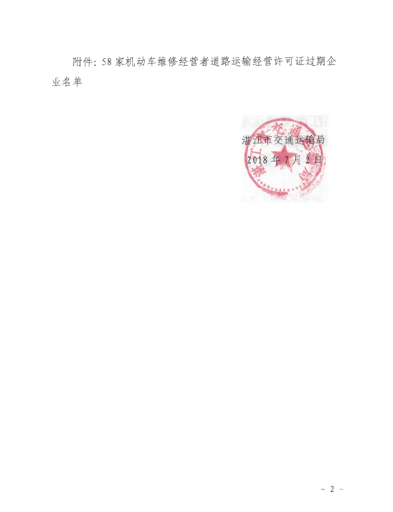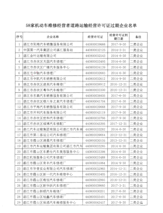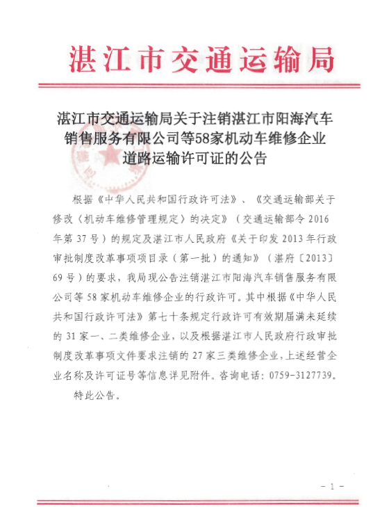 湛江市交通运输局关于注销湛江市阳海汽车销售服务有限公司等58家机动车维修企业道路运输许可证的公告