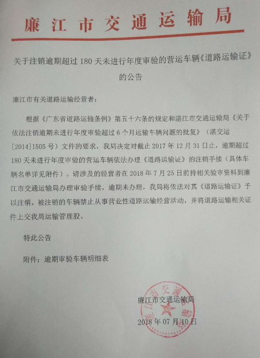 廉江市交通运输局关于注销逾期超过180天未进行年度审验的营运车辆