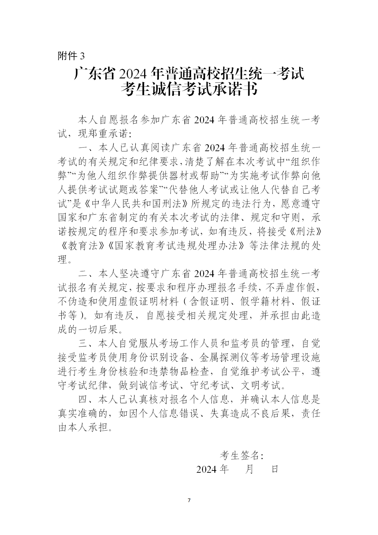 、户主页、父/母亲或监护人页、考生本人页,考生可提前准备好电子文档,方便报名时上传。 (四)确认报名。网上报名完成后,考生还须在规定时间内持二代(或三代)身份证、户口簿、学籍学历等证明材料到市县招生办公室指定的报名点办理确认报名手续。确认报名手续包括确认报名资格、校对和核准报考信息等。具体报名办法按《广东省2024年普通高校招生统一考试报名实施细则》(粤招〔2023〕7号文附件1附4)进行。 四、体检 补报名考生体检工作按照《关于做好广东省2024年普通高校招生体检工作的通知》(粤招〔2023〕8号)要求进行,考生须在当地招办统一安排下,于规定时间内完成体检。 五、相关要求 (一)各地招生考试机构要高度重视,按照《广东省普通高校招生统一考试报名工作管理办法(暂行)》(粤招办〔2022〕16号)的相关要求精心组织、严格管理,认真做好高考补报名工作,充分运用联网学籍、户籍数据审核考生报考资格,严格落实我省高考报名政策,严把资格审核关,确保我省2024年普通高考考生补报名工作顺利进行。 (二)考生提交各种报考资格证明材料时,须确保真实性,不得弄虚作假。凡弄虚作假、提交虚假证明的,一旦发现,取消报考资格,已经录取的,取消录取资格。 (三)考生须认真填写和核对报考信息,确保报考信息准确无误。考生报考信息是考生考试、填报志愿、录取审核、入学注册、学籍管理、学历证书发放的重要依据。考生报考信息的错漏可能给考生报名后续工作带来各种问题。考生在填写报名信息时,如有疑问应向学校老师和家长咨询,对包括考生本人的姓名、身份证号码、性别、户籍地、毕业学校等基本信息,以及外语语种、选考科目等报考科目信息均要仔细核对准确,考试科目一旦选定无特殊原因不予更改。