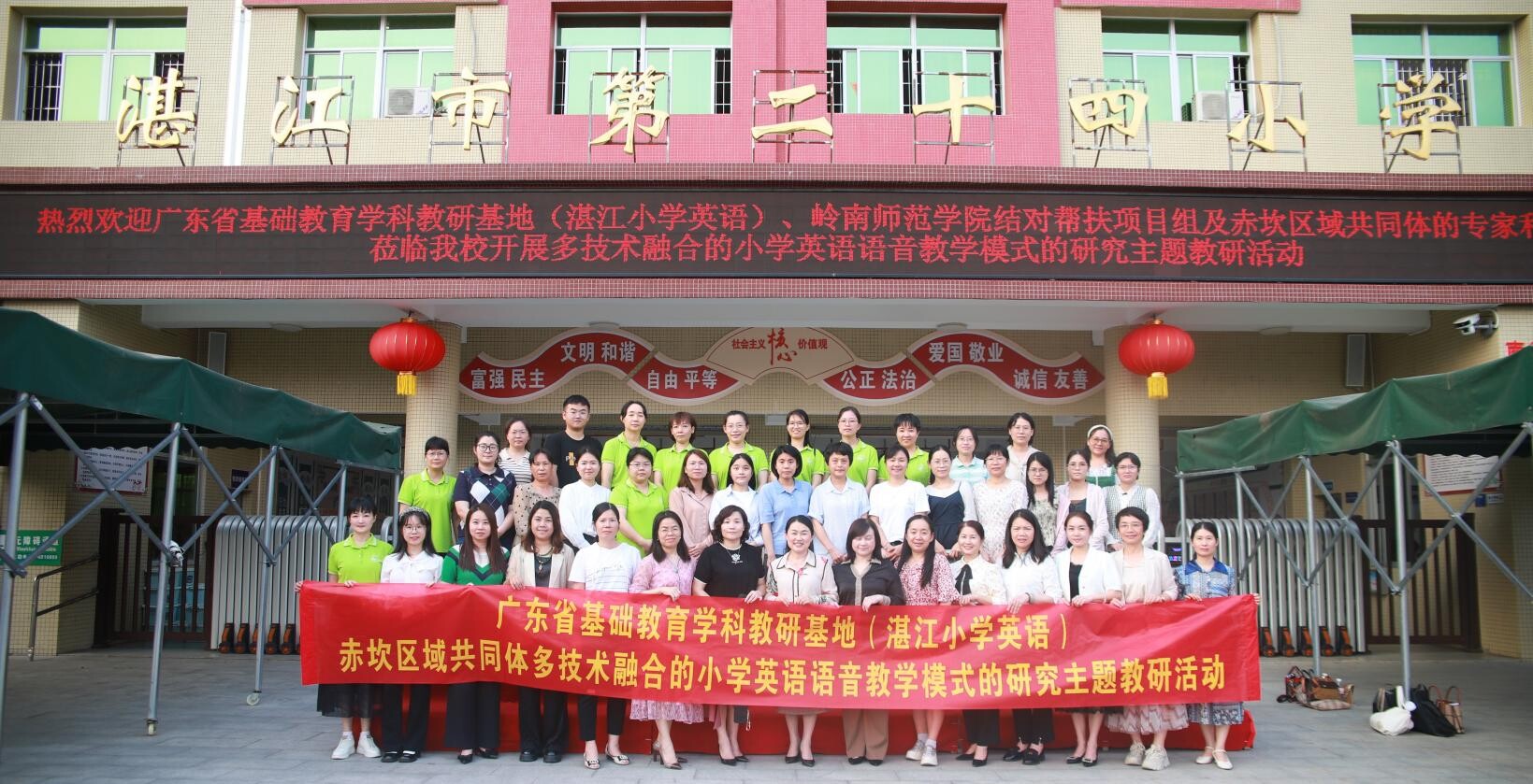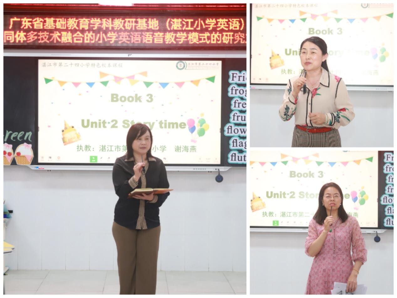 春风拂面心生暖,最是一年春好时。为贯彻落实《广东省基础教育教研基地项目建设实施办法(试行)》的通知》精神,扎实开展广东省基础教育学科教研基地建设,推动广东省基础教育学科(湛江小学英语)基地区域共同体建设,不断提升教师的课堂教学能力和教学水平,促进青年教师的专业成长,擦亮“学在赤坎”教育品牌,推动基础教育高质量发展,2024年4月1日,岭南师范外国语学院刘玉梅教授带领的帮扶团队及蔡艳莲副主任带领的广东省基础教育学科教研基地(湛江市小学英语)项目组及基地区域(赤坎、霞山、麻章)共同体在湛江市第二十四小学开展语音教学主题教研活动。