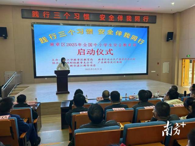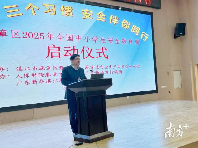近日,以“践行三个习惯,安全伴我同行”为主题的麻章区2025年全国中小学生安全教育周启动仪式在湛江市麻章第四小学报告厅举行。此次活动由麻章区教育局和麻章区安全生产委员会办公室主办,人保财险麻章支公司、广东新华发行集团、广东新华湛江新华书店协办。李开河常委,李倩怡副区长,区相关部门分管领导,区教育局领导班子成员和各股室负责人,教师发展中心主任,各学校校长与分管副校长,各幼儿园园长参加了活动。活动由李倩怡副区长主持。
