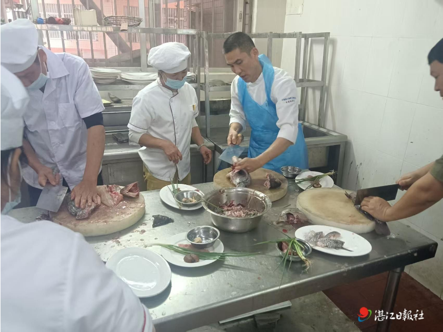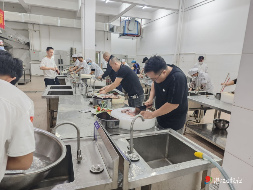 培训课程内容丰富且实用,既有职业道德、食品安全法规等底线要求,也有学生营养需求、粤西风味学生餐研发的专业知识;既有大锅菜烹饪的核心技巧,也有标准化操作的规范流程。在实操环节,烹饪名师现场演示技法,带领校园厨师们从菜品切配、调味到火候掌握逐一打磨,以“红烧鱼”“肉片炒青瓜”“香菇炒鸡肉”等常见食堂菜品为例,详细拆解大锅菜的标准化操作流程。灶台前,参训厨师们交流切磋,热气腾腾中充满了提升厨艺的热情。