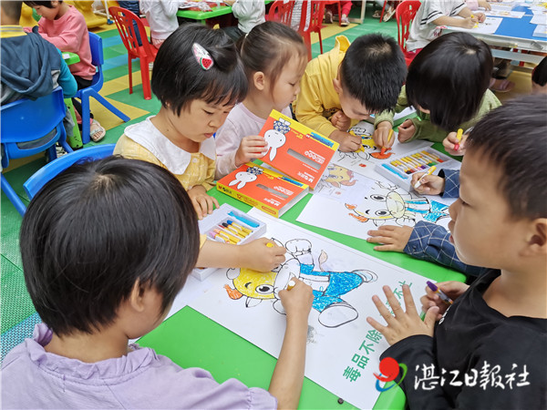 4月29日,赤坎区禁毒办、沙湾街道办、沙湾派出所等单位工作人员走进湛江金星幼儿园开展禁毒宣传公益活动(如图,记者林石湛 摄)。