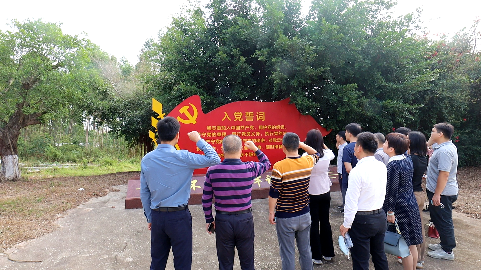 参观过程中,大家频频驻足、认真参观学习,了解到莫村莫氏大宗是湛江市中共党史学习教育基地、爱国主义教育基地。在抗法斗争、抗日战争时期,是村民召集会议、策划抵抗外寇的指挥中心,曾是中共地下党员秘密活动场所,也是支援解放战争的物资集发地。莫村村民在中国共产党领导下,在莫氏大宗成立抗日哨所、莫村抗日武装联络站、莫村抗日联防队、陇水乡抗日联防队等抗日组织,以莫氏大宗为据点和指挥部,开展抗日保家乡的斗争。大家深切缅怀和追忆革命先辈,接受革命教育和熏陶。参观结束后,面对鲜红的党旗,全部党员高举右拳,重温入党誓词,追忆入党初心。