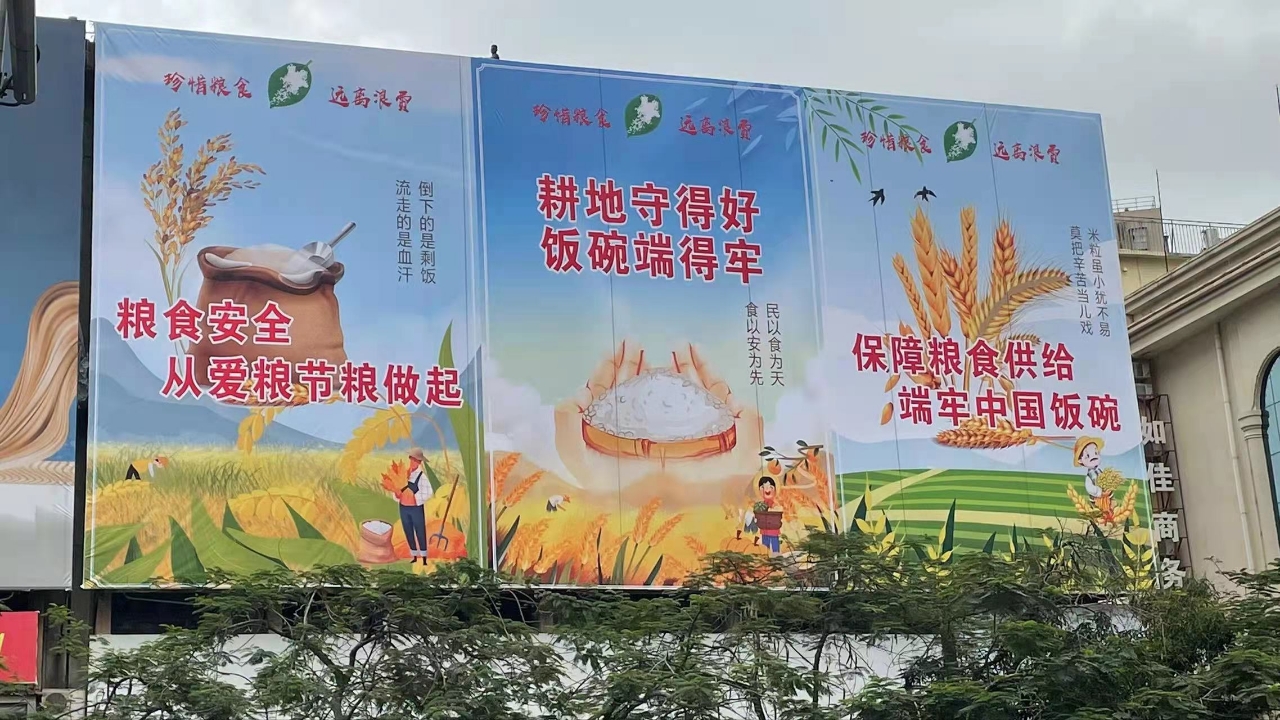 据悉,该广告牌位置的部分物业属中心库所有,现已闲置,由于长期裸露在外,遭受风吹日晒等原因造成褪色、破损等现象,严重影响了市容市貌。为传递城市内在气质,扮靓城市颜值,引领风尚,点亮文明之光。近日,市粮食储备中心库对该广告牌进行整治更换。“粮食安全,从爱粮节粮做起”“耕地守得好,饭碗端得牢”“保障粮食供给,端牢中国饭碗”,三幅图文并茂,以“粮食安全”为主题的公益宣传广告进入公众视野,成为一道靓丽的风景线,潜移默化影响着广大居民在生活中爱粮、节粮、惜粮,关注粮食安全,拒绝铺张浪费,让节约粮食、反对浪费在全社会蔚然成风。