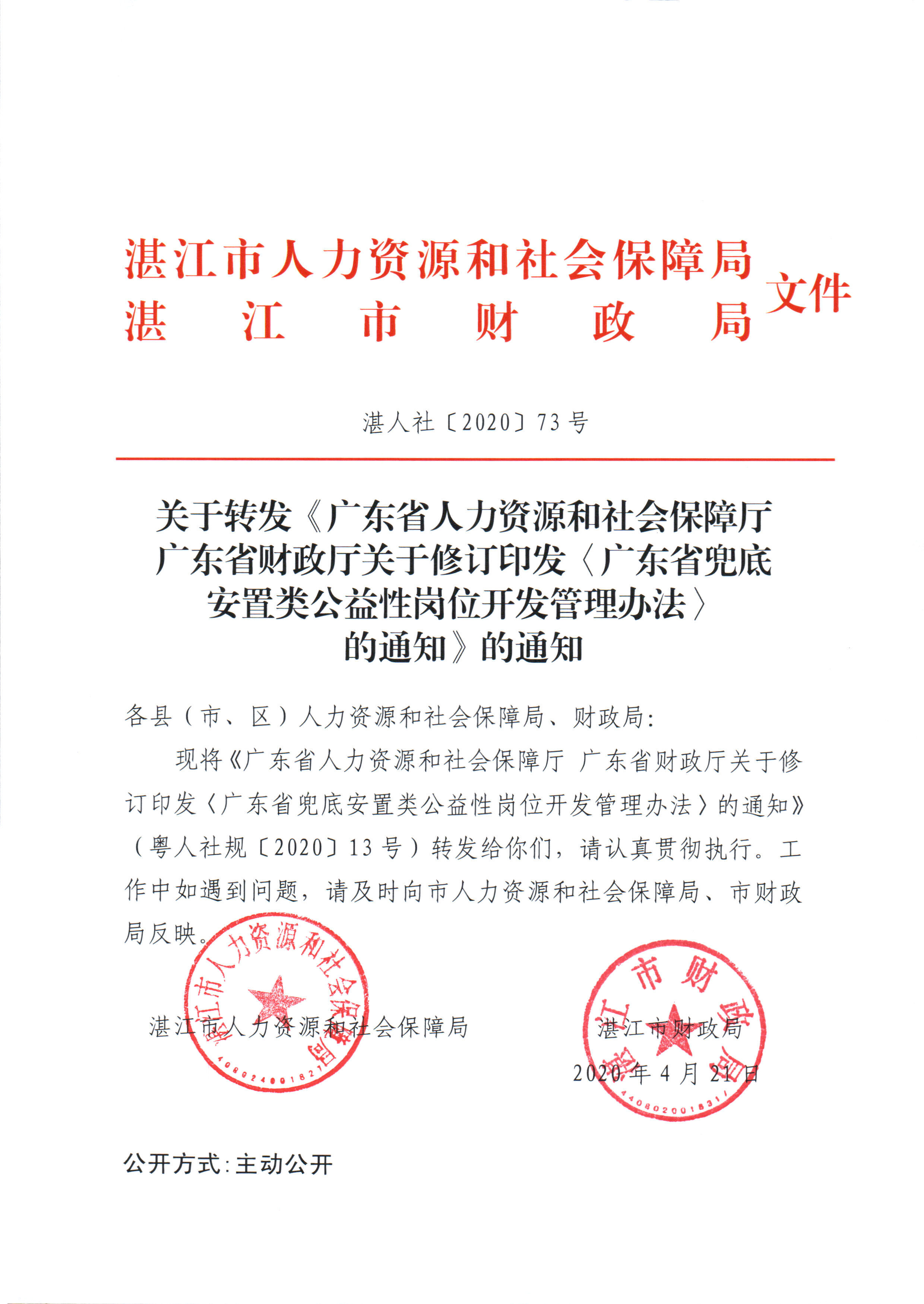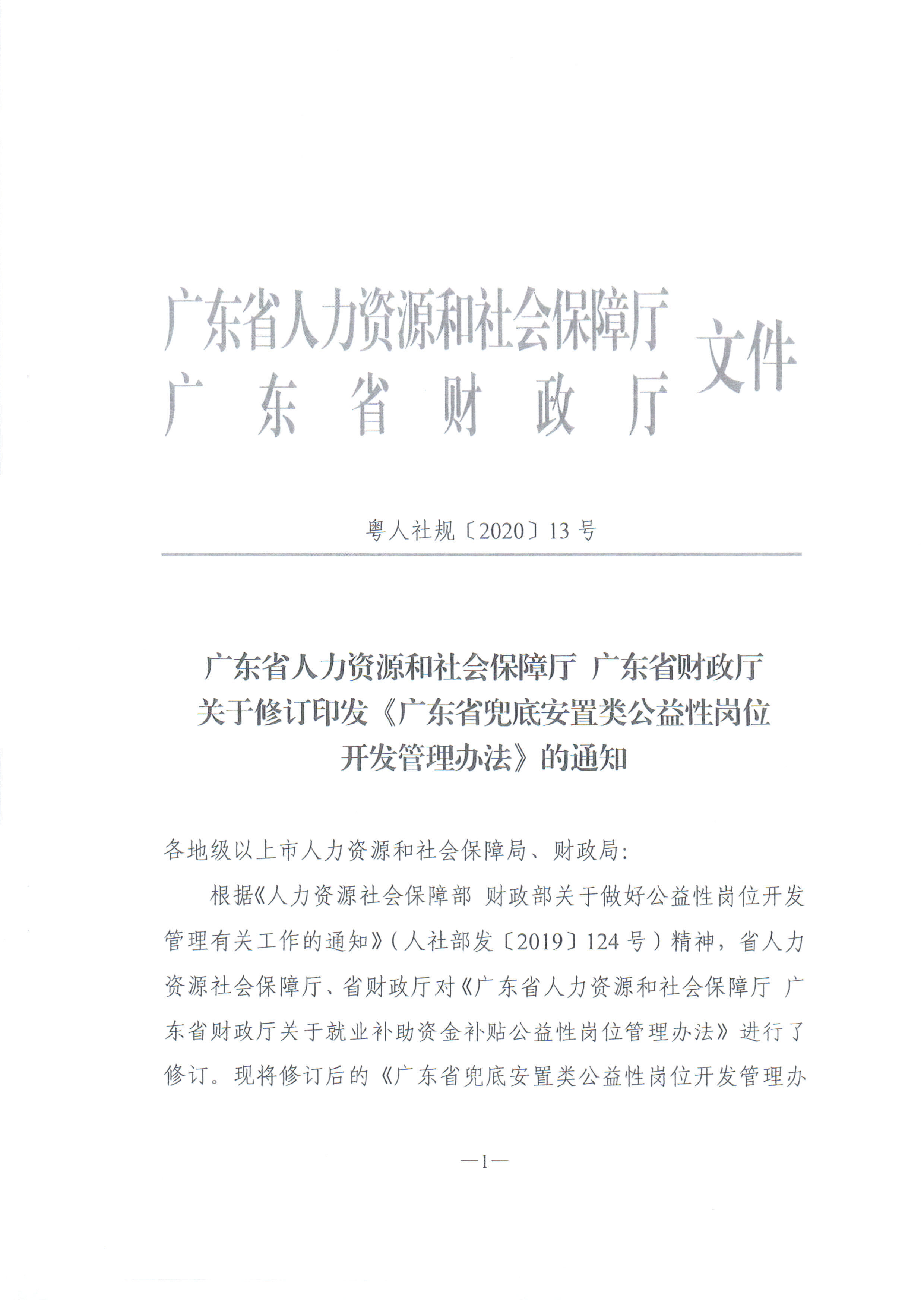 关于转发《广东省人力资源和社会保障厅 广东省财政厅关于修订印发〈广东省兜底安置类公益性岗位开发管理办法〉的通知》的通知