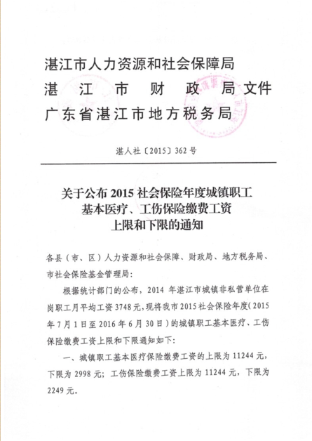 关于公布2015社会保险年度城镇职工基本医疗、工伤保险缴费工资上限和下限的通知