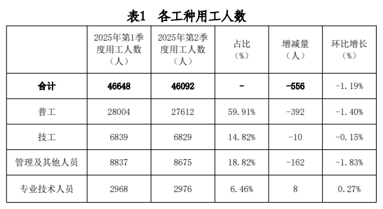 (四)薪酬待遇:2025年第2季度,普工月平均工资3264元,技工月平均工资3848元,管理及其他人员月平均工资5924元,专业技术人员月平均工资4855元。从薪酬水平情况看,薪酬最高的为管理及其他人员,薪酬最低的为普工。