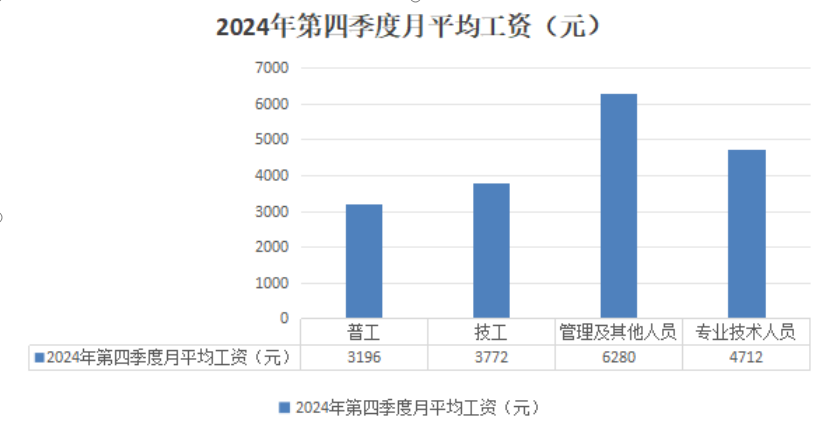 (四)薪酬待遇:2024年第4季度,普工月平均工资3196元,技工月平均工资3772元,管理及其他人员月平均工资6280元,专业技术人员月平均工资4712元。