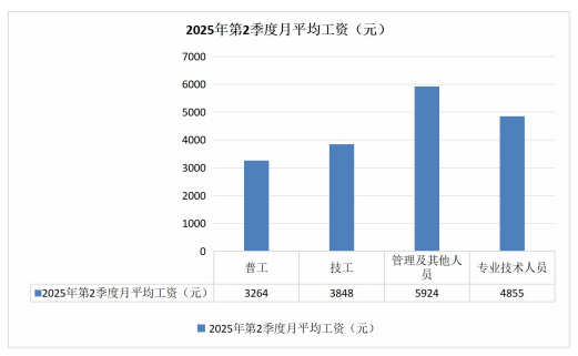 (四)薪酬待遇:2025年第2季度,普工月平均工资3264元,技工月平均工资3848元,管理及其他人员月平均工资5924元,专业技术人员月平均工资4855元。从薪酬水平情况看,薪酬最高的为管理及其他人员,薪酬最低的为普工。