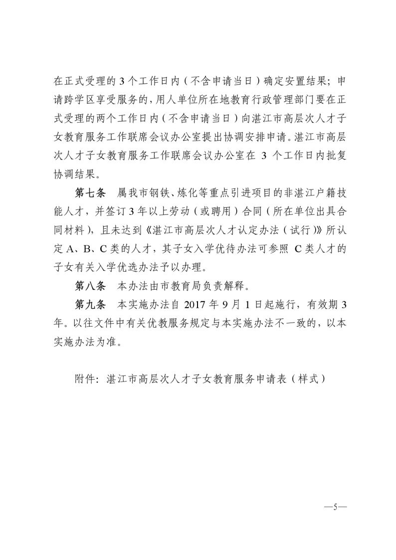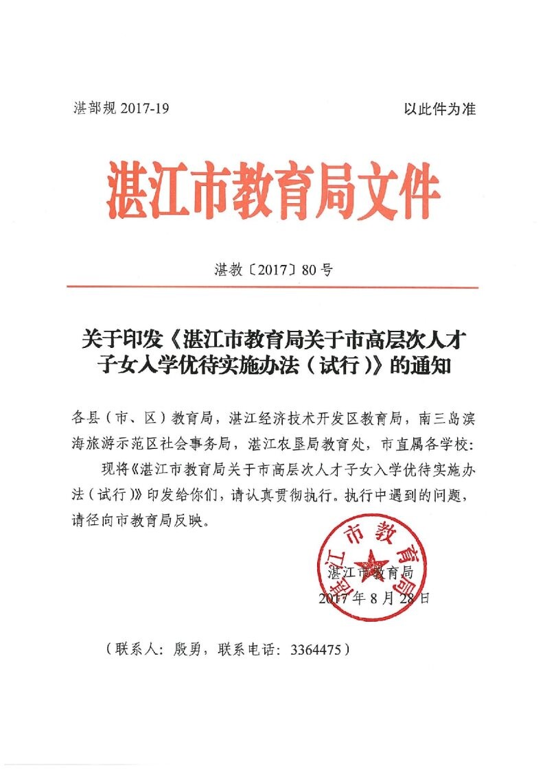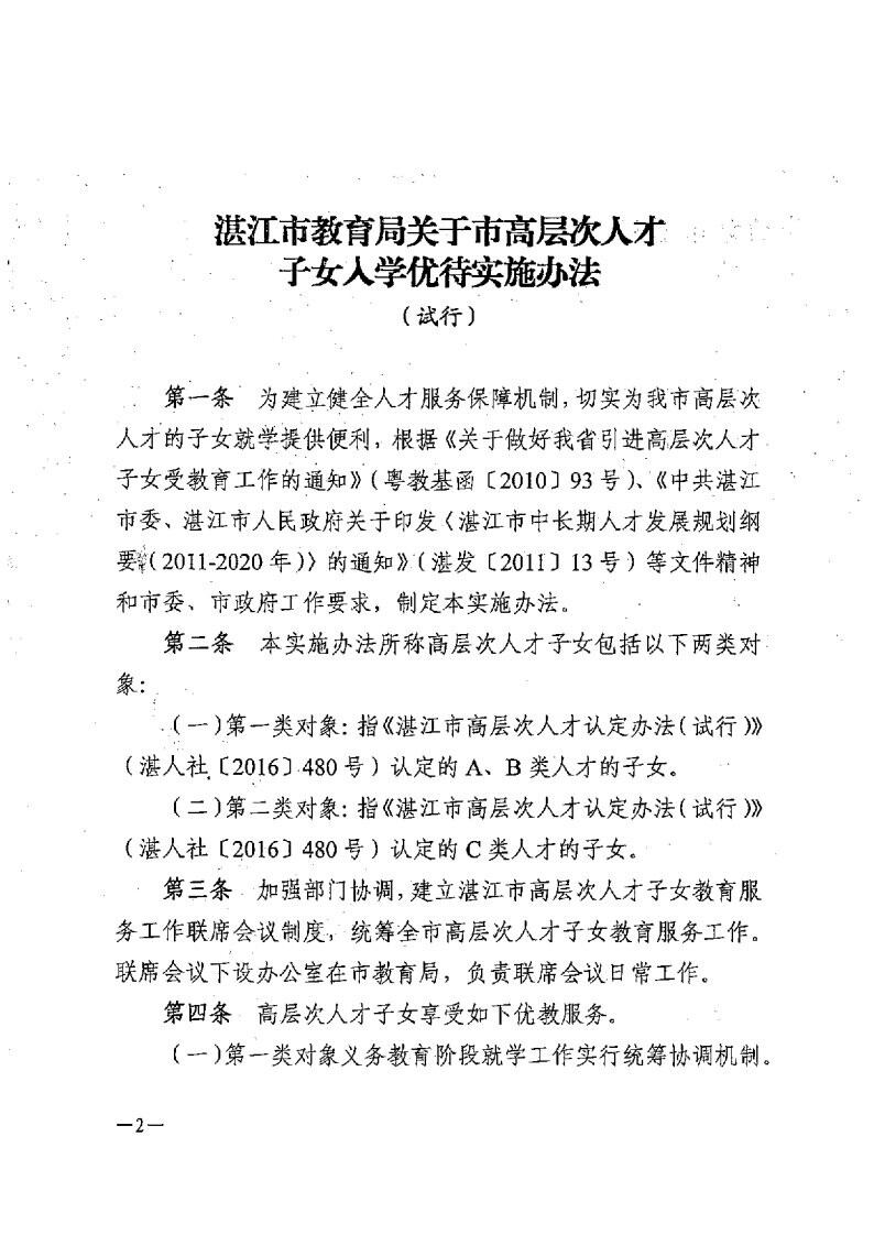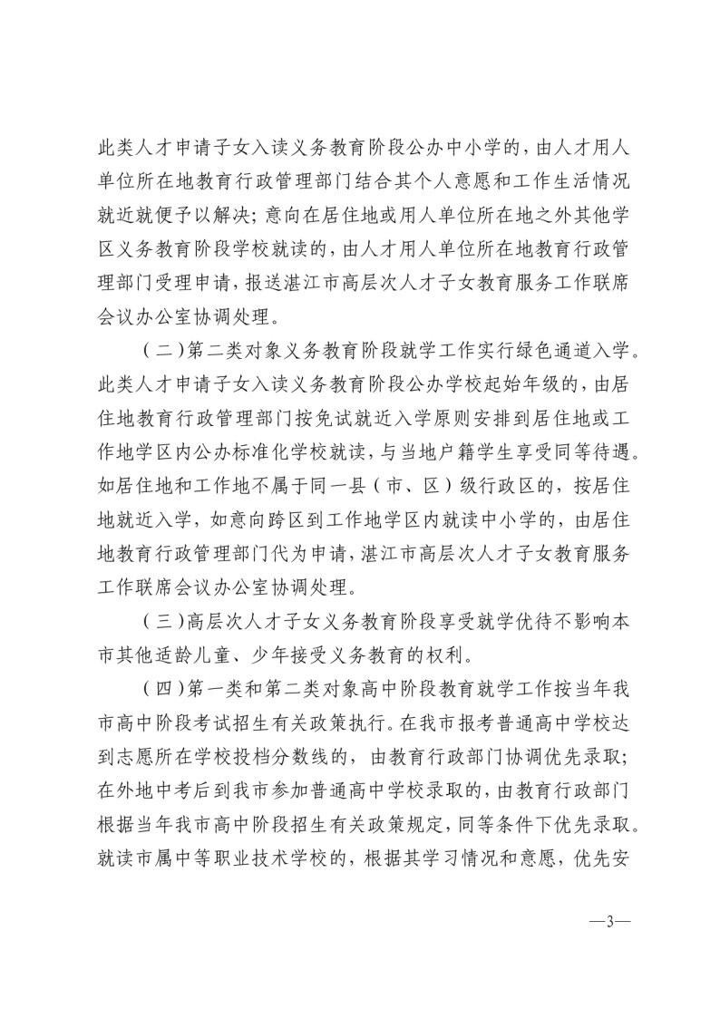 关于印发《湛江市教育局关于市高层次人才子女入学优待实施办法(试行)》的通知