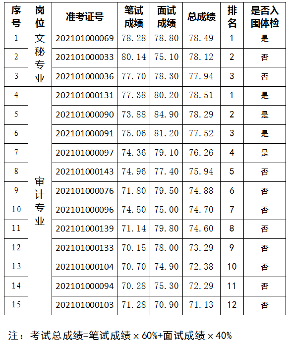 湛江市审计局2021年度公开选调公务员考试笔试和面试工作业已结束,根据《湛江市审计局2021年度公开选调公务员公告》的要求,现将总成绩及入围体检人员名单予以公布(详见附表),如排名前者因体检不合格,则按总成绩从高分到低分的顺序依次递补入围体检。体检相关事宜及有关要求我局将通过“粤政易”通知,望入围体检考生注意查收。