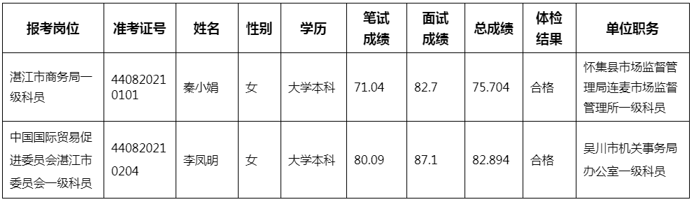 根据《2021年度湛江市商务局公开选调公务员公告》的要求,经资格审核、笔试、面试、体检、考察、集体研究等环节,现确定秦小娟同志作为湛江市商务局一级科员拟选调人选、李凤明同志作为中国国际贸易促进委员会湛江市委员会一级科员拟选调人选,现按规定予以公示。公示期间,如对拟选调录用人员有异议,请以书面形式(包括必要的证明材料)向湛江市商务局提出,并写明联系人姓名和联系电话,匿名信函将不予受理。