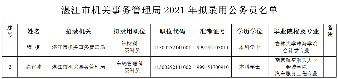 根据《公务员法》和《广东省2021年考试录用公务员公告》要求,程棋、陈竹帅同志参加广东省2021年录用公务员考试,经笔试、面试、体检和考察等程序,符合公务员录用条件,拟录用为湛江市机关事务管理局计财科一级科员、车辆管理科一级科员,现将有关情况予以公示。