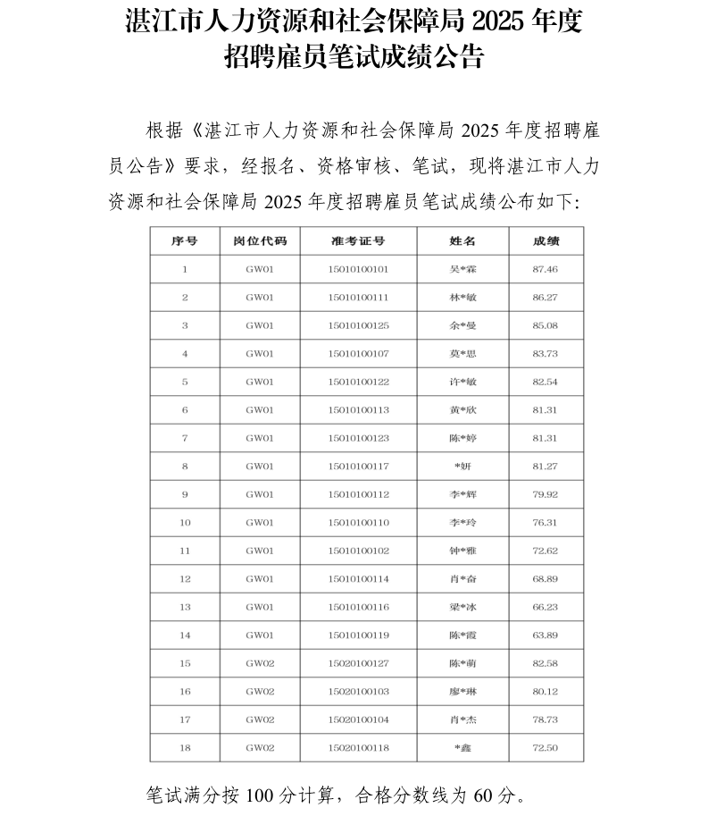 湛江市人力资源和社会保障局2025年度 招聘雇员笔试成绩公告