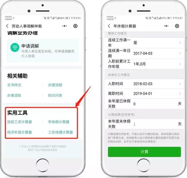 工伤待遇计算器、经济补偿计算器、年休假天数计算器等计算辅助功能,当事人简单输入个人入职时间、工资标准、工伤等级等就可得出相应待遇,让合法权益更有预期。