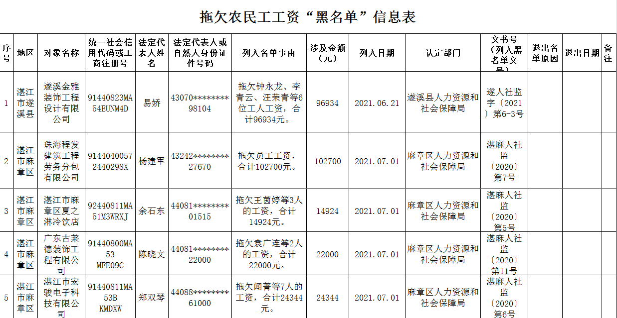 拖欠农民工工资“黑名单”信息表(湛江2021年第三季度)