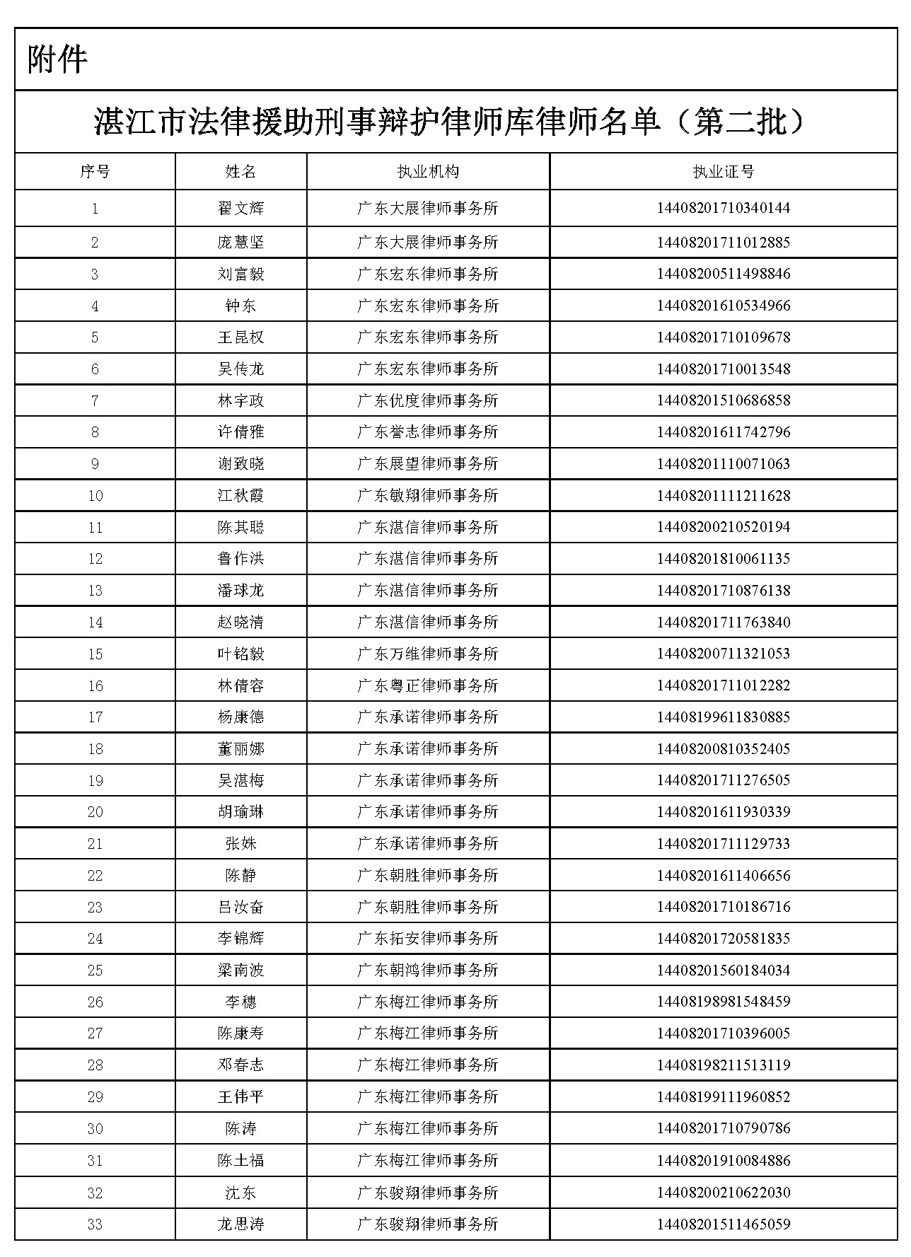 关于湛江市法律援助刑事辩护律师库律师名单(第二批)的公示