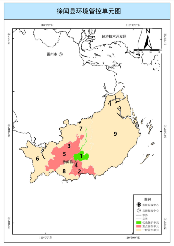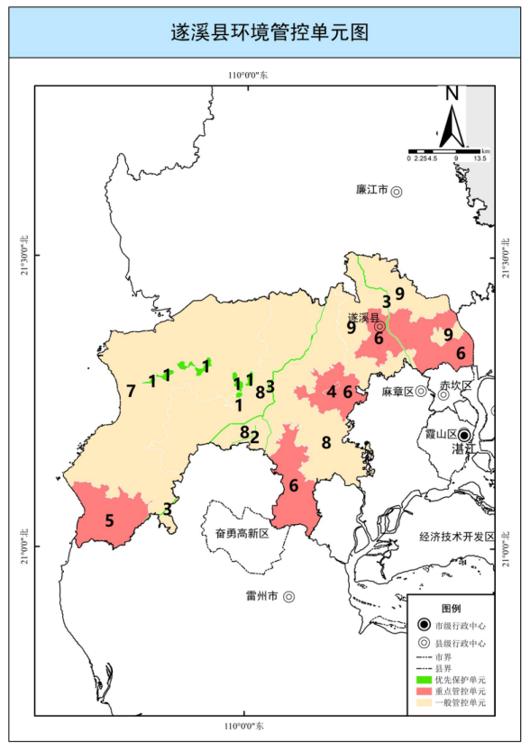 全市共划定陆域环境管控单元89个,其中,优先保护单元23个,面积563.13平方公里,占全市陆域国土面积的4.25%,主要涵盖生态保护红线、一般生态空间、饮用水水源保护区、环境空气质量一类功能区等区域,主要分布在廉江北部丘陵山地生态屏障,雷州半岛中部林地生态屏障,以及南渡河、雷州青年运河、鉴江干流、鹤地水库、东吴水库、龙门水库、大水桥水库等饮用水水源保护区,与市域生态安全格局基本吻合;重点管控单元40个,面积5193.66平方公里,占全市陆域国土面积的39.15%,主要包括工业集聚、人口集中和环境质量超标区域;一般管控单元26个,面积7507.77平方公里,占全市陆域国土面积的56.60%,为优先保护单元、重点管控单元以外的区域。