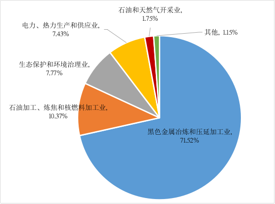 2023年,一般工业固体废物产生量排名前5的行业依次为黑色金属冶炼和压延加工业、电力、热力生产和供应业、农副食品加工业、非金属矿采选业、石油加工、炼焦和核燃料加工业,分别占全市一般工业固体废物产生量的65.92%20.12%4.65%2.87%2.86%,详细情况见图1