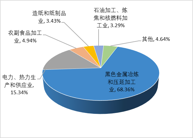 2024年,一般工业固体废物产生量排名前5的行业依次为黑色金属冶炼和压延加工业、电力、热力生产和供应业、农副食品加工业、造纸和纸制品业、石油加工、炼焦和核燃料加工业,分别占全市一般工业固体废物产生量的68.36%、15.34%、4.94%、3.43%、3.29%,详细情况见图 1。