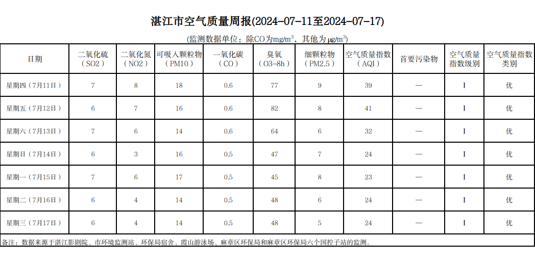 湛江市空气质量周报(2024-07-11至2024-07-17)