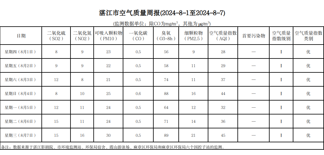 湛江市空气质量周报(2024-8-1至2024-8-7)