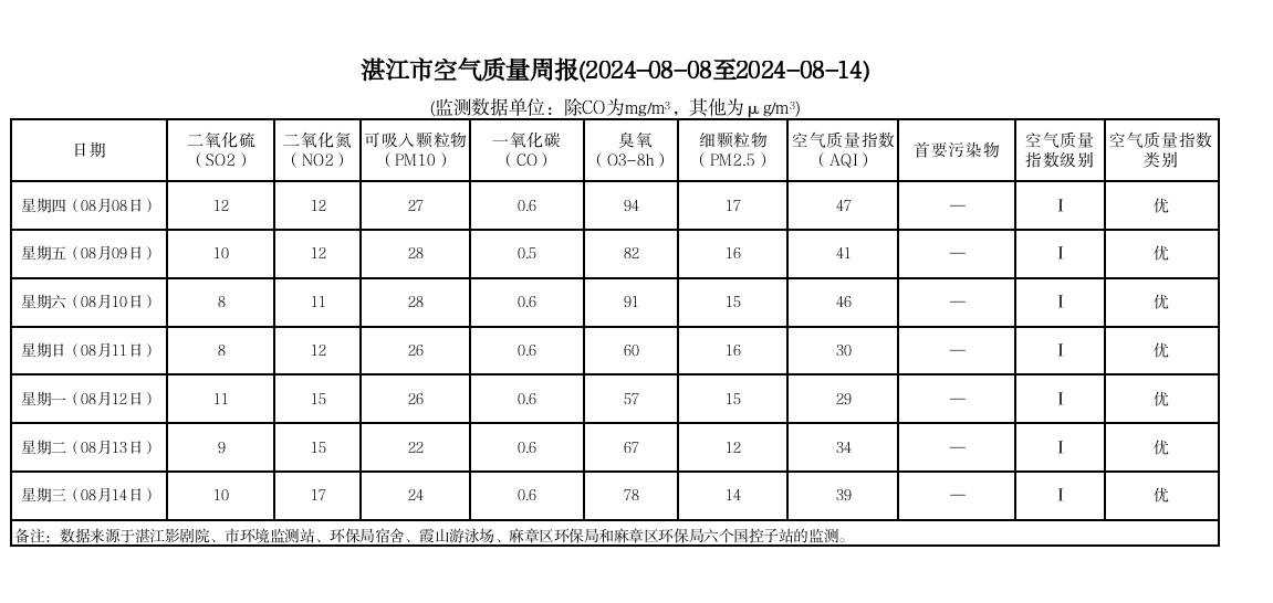 湛江市空气质量周报(2024-08-08至2024-08-14)
