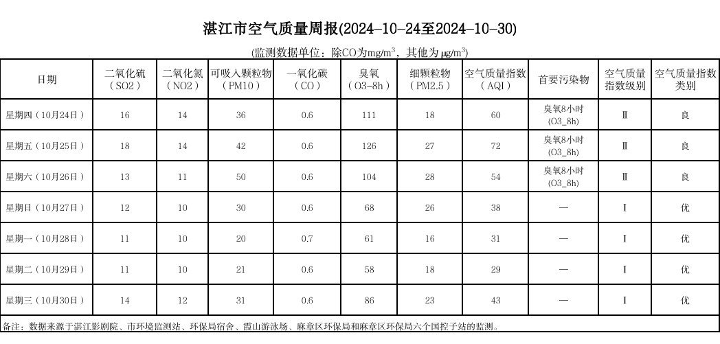 湛江市空气质量周报(2024-10-24至2024-10-30)