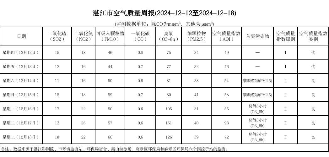 湛江市空气质量周报(2024-12-12至2024-12-18)