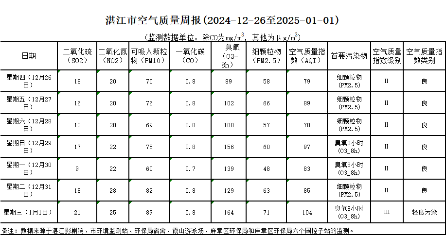 湛江市空气质量周报(2024-12-26至2025-01-01)