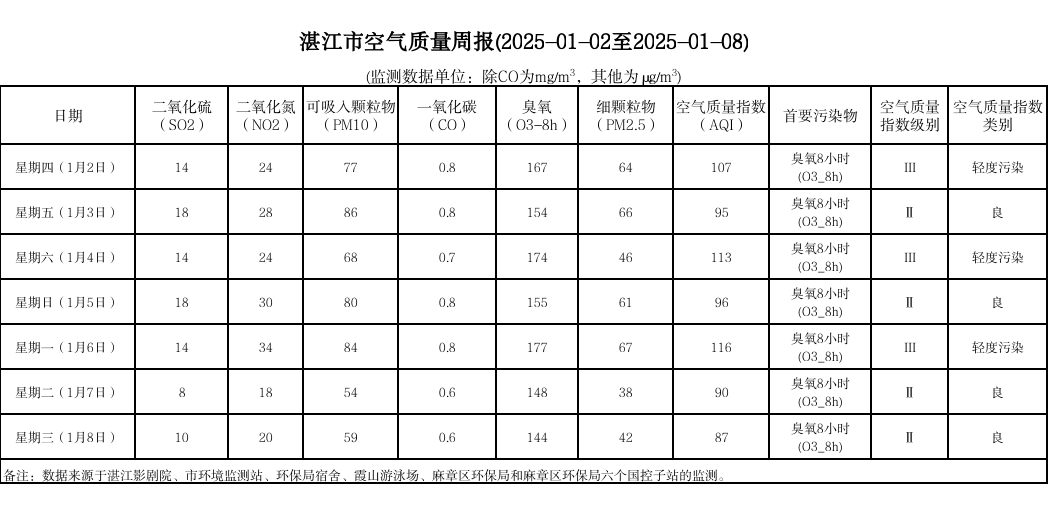 湛江市空气质量周报(2025-01-02至2025-01-08)