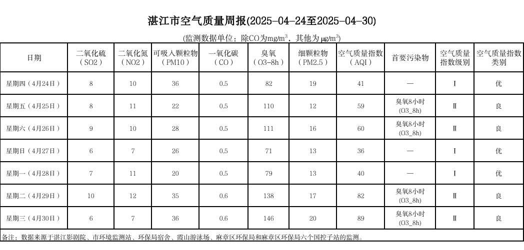 湛江市空气质量周报(2025-04-24至2025-04-30)