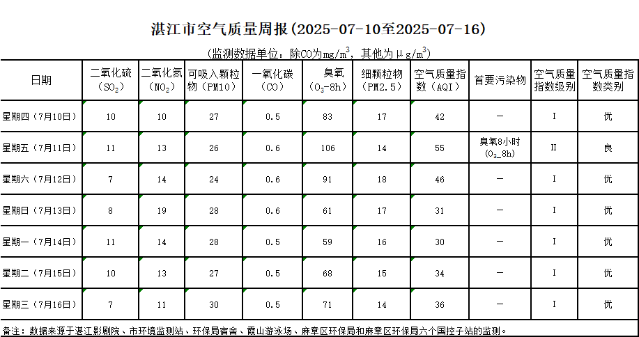 湛江市空气质量周报(2025-07-10至2025-07-16)