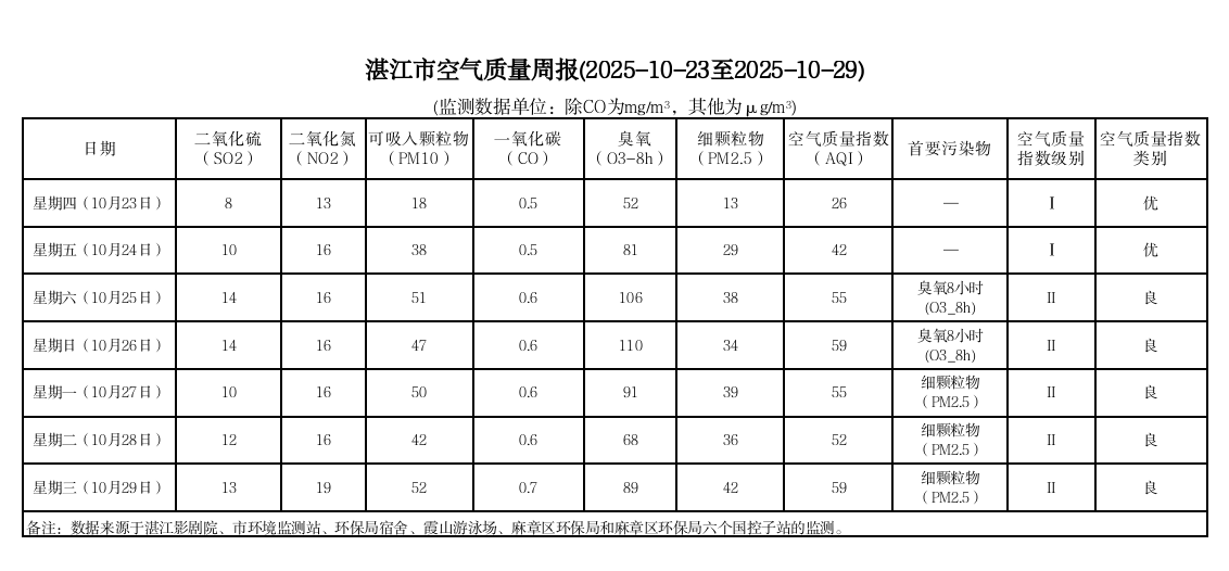 湛江市空气质量周报(2025-10-23至2025-10-29)