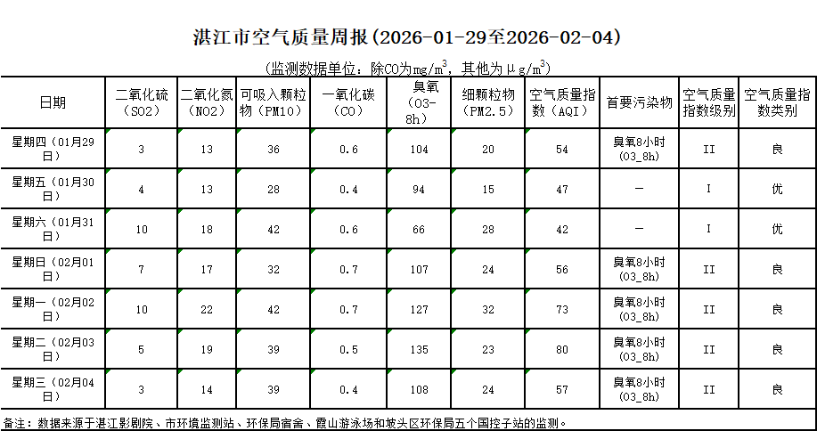 湛江市空气质量周报(2026-01-29至2026-02-04)