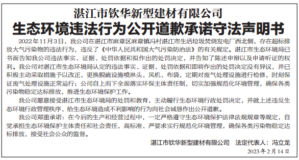 湛江市钦华新型建材有限公司2023214日在《湛江日报》A07版登报公开道歉、承诺守法。