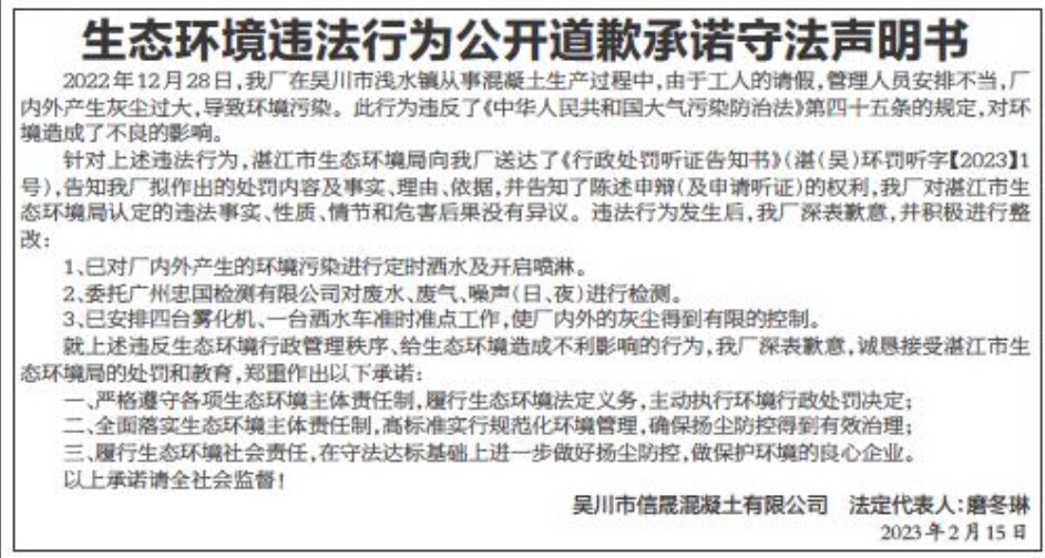吴川市信晟混凝土有限公司于2023217日在湛江日报A05版登报,公开道歉并作出守法承诺。