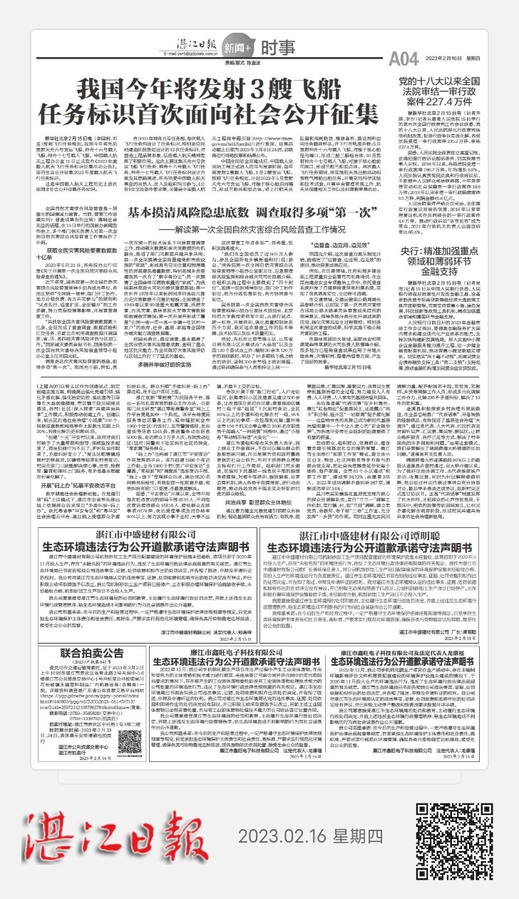 湛江市中盛建材有限公司于202331日在《湛江日报》A04版登报对其未取得排污许可证排放水污染物的行为进行公开道歉。