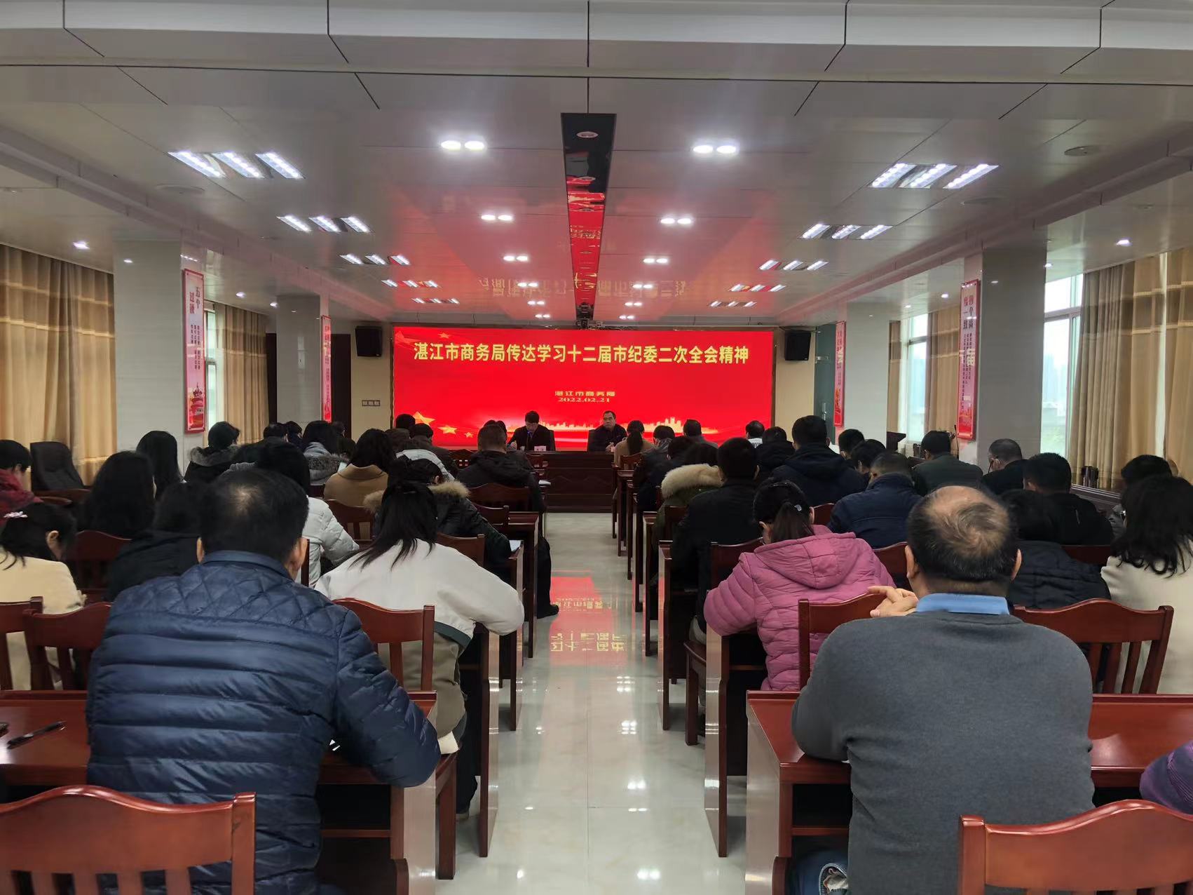 2月21日上午,湛江市商务局召开全体干部职工会议,传达学习中共湛江市第十二届纪委二次全会精神。局党组书记、局长余庆创同志主持会议并讲话。局党组成员、派驻纪检组组长李湛同志会上传达学习了十九届中央纪委六次全会、十二届省纪委七次全会和十二届市纪委二次全会精神。