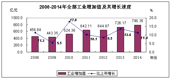 全年全部工业总产值2674.16亿元,比上年增长13.5%。其中,规模以上工业总产值2246.58亿元,增长14.8%。