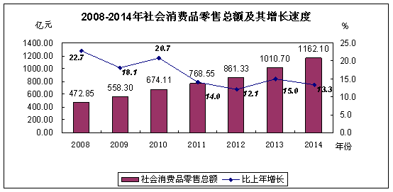 全年社会消费品零售总额1162.10亿元,比上年增长13.3%。分地域看,城镇消费品零售额1041.06亿元,增长13.4%,占全市社会商品零售额的89.6%;乡村消费品零售额121.04亿元,增长12.3%,占全市商品零售总额的10.4%。分行业看,批发业零售额197.71亿元,增长24.7%;零售业零售额824.68亿元,增长11.3%;住宿业零售额8.76亿元,增长9.0%;餐饮业零售额130.95亿元,增长10.9%。