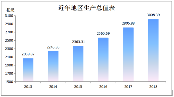 初步核算并经广东省统计局核定,2018年全市实现地区生产总值3008.39亿元,比上年增长6.0%。其中,第一产业增加值533.61亿元,增长4.5%,对GDP增长贡献率为12.6%;第二产业增加值1086.61亿元,增长5.2%,对GDP增长贡献率为33.7%;第三产业增加值1388.16亿元,增长7.2%,对GDP增长贡献率为53.7%。三次产业结构为17.7:36.1:46.1,第三产业所占比重比上年提高1.3个百分点。在第三产业中,批发和零售业增加值增长5.1%,住宿和餐饮业增加值增长3.1%,金融业增加值增长6.7%,房地产业增加值增长2.0%。现代服务业增加值700.56亿元,增长8.1%。生产性服务业增加值534.45亿元,增长6.8%。民营经济增加值1924.91亿元,增长6.6%,占地区生产总值的64.0%。2018年,湛江人均地区生产总值41107元,按平均汇率折算为6212美元,增长5.6%。