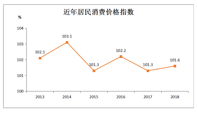 全年市区居民消费价格比上年上涨1.6%。分类别看,食品烟酒类价格上涨1.1%;衣着类价格上涨0.5%;居住类价格上涨2.3%;生活用品及服务类价格上涨0.4%;交通和通信类价格上涨1.7%;教育文化和娱乐类上涨1.4%;医疗保健类价格上涨4.1%;其他用品和服务价格上涨0.8%。