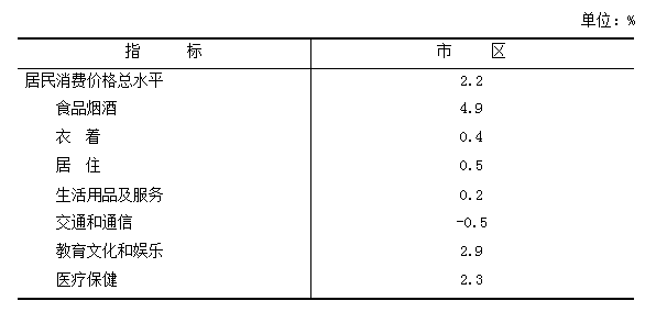全年市区居民消费价格总水平上涨2.2%。分类别看,食品烟酒类价格上涨4.9%,其中,粮食上涨0.9%,鲜菜上涨16.4%,畜肉类上涨14.2%,水产品上涨3.0%,蛋类下降0.2%,在外餐饮上涨3.0%;衣着类价格上涨0.4%;居住类价格上涨0.5%;生活用品及服务类价格上涨0.2%;交通和通信类价格下降0.5%;教育文化和娱乐类上涨2.9%;医疗保健类价格上涨2.3%。全年工业生产者出厂价格下降0.8%。