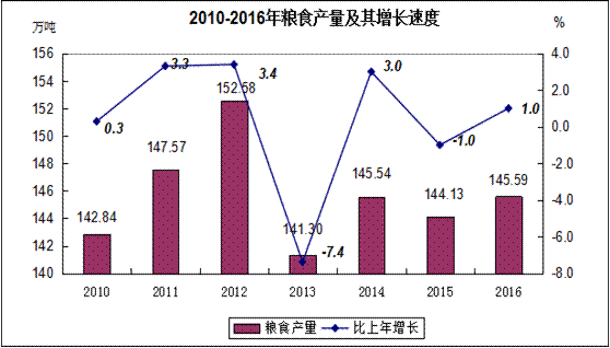 全年粮食产量145.59万吨,增产1.46万吨,增长1.0%;糖蔗产量1147.54万吨,增产20.28万吨,增长1.8%;蔬菜产量381.75万吨,增产17.19万吨,增长4.7%;水果总产量295.14万吨,增产 11.82万吨,增长4.2%。