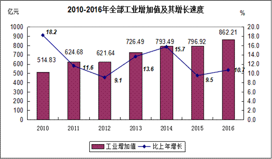 全年全部工业完成增加值862.21亿元,比上年增长10.7%。规模以上工业企业实现增加值766.52亿元,增长11.5%;其中:国有及国有控股企业实现增加值215.72亿元,增长20.8%;股份制企业实现增加值462.51亿元,增长14.1%;外商及港澳台企业实现增加值262.53亿元,增长7.8%;按轻、重工业分,轻工业增加值359.47亿元,增长11.1%;重工业增加值407.05亿元,增长11.7%。
