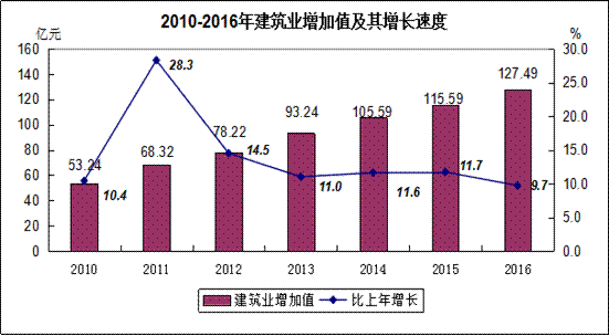 全年建筑业增加值127.49亿元,比上年增长9.7%;全市资质等级以上建筑企业125家,实现总产值533.15亿元,比上年增长15.9%;实现利润总额10.7亿元,增长19.4%。房屋建筑施工面积3723.52万平方米,增长10.8%。