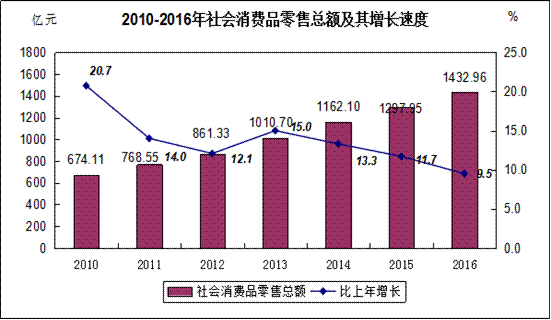 全年社会消费品零售总额1432.96亿元,增长9.5%,扣除物价因素,实际增长8.3%。其中,城镇消费品零售额1165.28亿元,占全市社会商品零售额的81.3%,增长9.1%;乡村消费品零售额267.68亿元,占全市商品零售总额的18.7%,增长11.1%。分行业看,批发业零售额351.80亿元, 增长7.8%;零售业零售额919.12亿元,增长10.5%;住宿业零售额12.74亿元,增长0.2%;餐饮业零售额149.30亿元,增长8.0%。