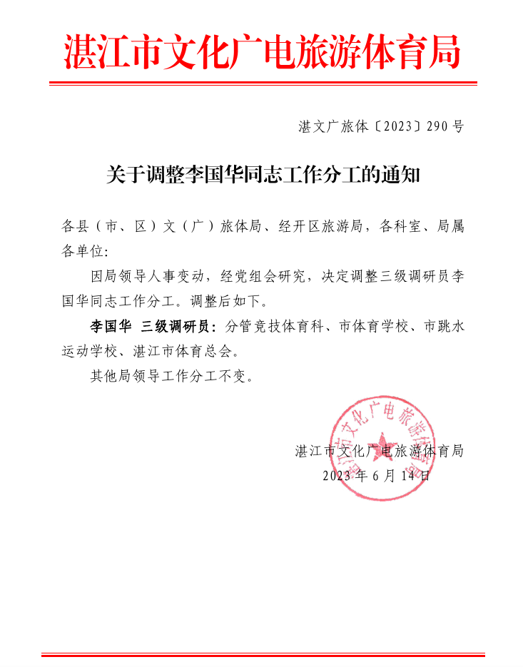 关于调整李国华同志工作分工的通知